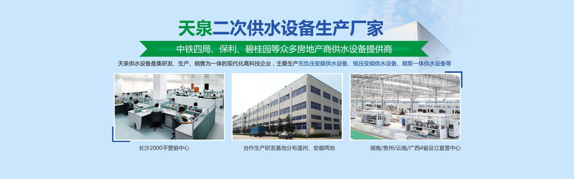 長(zhǎng)沙天泉供水設(shè)備有限公司位于長(zhǎng)沙雨花經(jīng)濟(jì)開(kāi)發(fā)區(qū)。公司是集研發(fā)、生產(chǎn)、銷售為一體的現(xiàn)代化科技型企業(yè)公司生產(chǎn)銷售的產(chǎn)品有無(wú)負(fù)壓變頻供水設(shè)備、自來(lái)水加壓泵站、變頻調(diào)速恒壓供水設(shè)備、智慧標(biāo)準(zhǔn)泵房、智慧水務(wù)、一體化預(yù)制泵站、循環(huán)水系統(tǒng)工程等二十幾大類別。